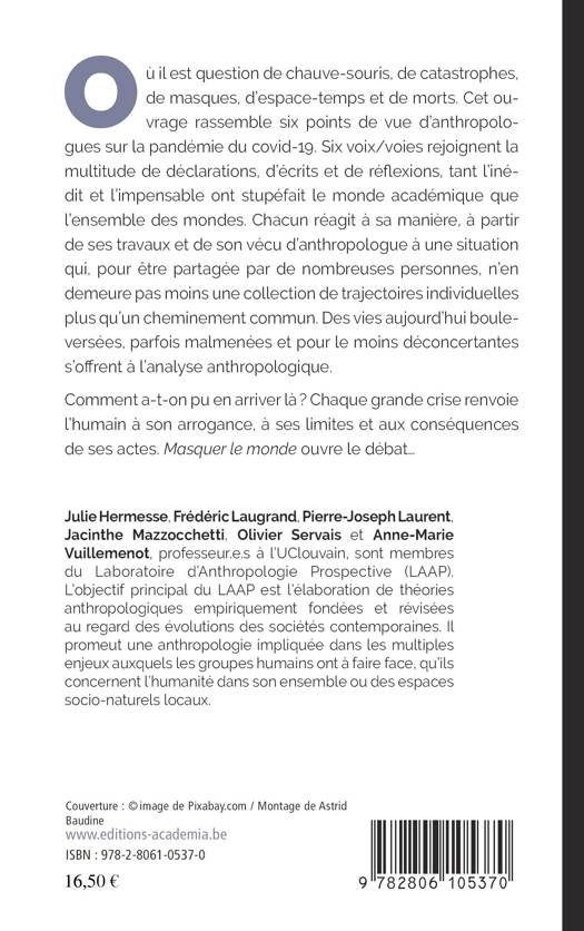 Cet ouvrage rassemble six points de vue d'anthropologues sur l'impensable et l'impensé de la pandémie Covid-19. Des vies aujourd'hui bouleversées, parfois malmenées et pour le moins déconcertantes s'offrent à l'analyse anthropologique. Comment a-t-on pu en arriver là?? Chaque grande crise renvoie l'humain à son arrogance, à ses limites et aux conséquences de ses actes. Masquer le monde ouvre le débat...
