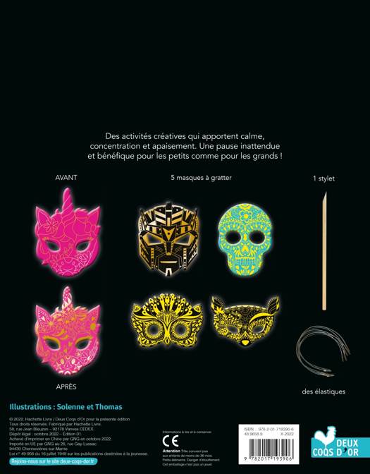 5 masques à gratter avec un effet phosphorescent dans le noir ou de dorure qui apparaît lorsque l'on gratte l'encre...
