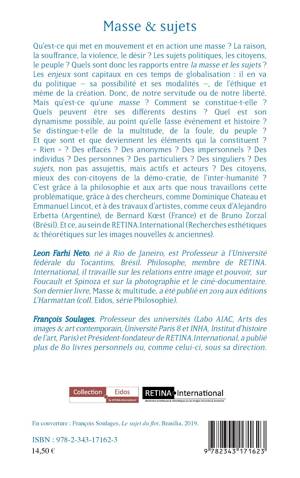 Qu'est-ce qui met en mouvement et en action une masse ? La raison, la souffrance, la violence, le désir ? Les sujets politiques, les citoyens, le peuple ? Quels sont donc les rapports entre la masse et les sujets ? Les enjeux sont capitaux en ces temps de globalisation : il en va du politique sa possibilité et ses modalités , de l'éthique et même de la création. Donc, de notre servitude ou de notre liberté.