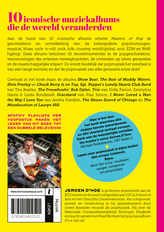 Aan de hand van 10 iconische albums schetst Masters of Pop de geschiedenis en ontwikkeling van de belangrijkste popstromingen; musical, blues, rock-'n-roll, rock, folk, country, world/global, soul, EDM en R&B/hiphop. Deze albums belichten 10 sleutelmomenten in de popgeschiedenis: vernieuwingen die artiesten teweegbrachten, de invloeden op latere generaties en de maatschappelijke impact. Zo wordt duidelijk dat popmuziek het resultaat is van een lange evolutie en dat de popmuziek van elke generatie ertoe doet! Centraal in het boek staan de albums Show Boat, The Best of Muddy Waters, Elvis Presley en Chuck Berry Is on Top, Sgt. Pepper's Lonely Hearts Club Band van The Beatles, The Freewheelin' Bob Dylan, Trio van Dolly Parton, Emmylou Harris & Linda Rondstadt, Graceland van Paul Simon, I Never Loved a Man the Way I Love You van Aretha Franklin, The House Sound of Chicago en The Miseducation of Lauryn Hill. Spotify playlists per hoofdstuk maken het lezen van dit boek tot een dubbele belevenis!