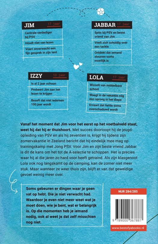 Vanaf het moment dat Jim voor het eerst op het voetbalveld staat, weet hij dat hij er thuishoort. Met succes doorloopt hij de jeugdopleiding van PSV en als hij zeventien is, krijgt hij tijdens zijn zomervakantie in Zeeland bericht dat hij eindelijk mee mag op trainingskamp. Voor Jim en zijn beste vriend Jabbar is dit de kans om het tot de A-selectie te schoppen. Het is precies waar hij al die jaren zo hard voor heeft getraind. Als zijn klasgenoot Lola ook nog langskomt op de camping, kan de zomer niet meer stuk. Maar wanneer ze weer thuis zijn, blijft er van dat geweldige gevoel weinig meer over.