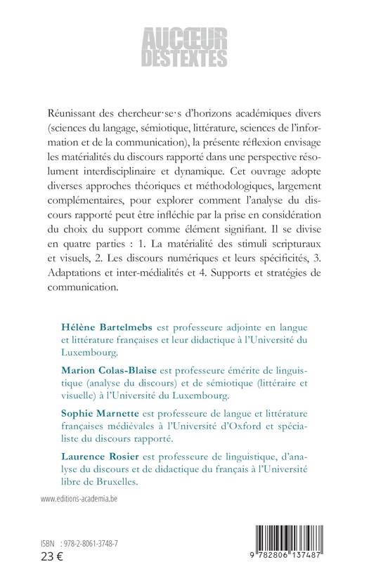En quoi cet ouvrage collectif sur le discours rapporté est-il différent des nombreuses publications consacrées à ce phénomène linguistique ? L'accent est mis sur les matérialités du discours rapporté sur la manière dont les stratégies énonciatives changent en fonction du médium et du support, qui fonctionnent comme des éléments signfiants. L'approche choisie est pluridisciplinaire et dynamique, le livre donnant la parole à des chercheurs en linguistique, en sémiotique et en littérature de traditions différentes.