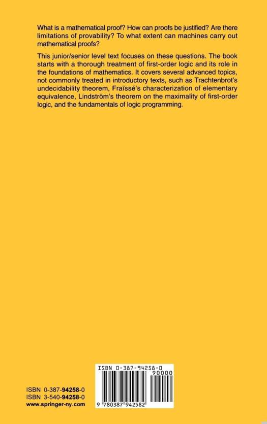 This junior/senior level text starts with a thorough treatment of first-order logic and its role in the foundations of mathematics. It covers several advanced topics, not commonly treated in introductory texts, such as Trachtenbrot's undecidability theorem, Fraïssé's characterization of elementary equivalence, Lindström's theorem on the maximality of first-order logic, and the fundamentals of logic programming.