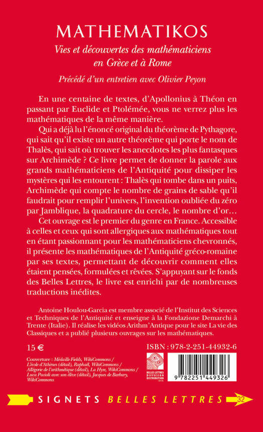 Precede d'un entretien avec Olivier PeyonEn une centaine de textes, d'Apollonius a Theon en passant par Euclide et Ptolemee, vous ne verrez plus les mathematiques de la meme maniere. Qui a deja lu l'enonce original du theoreme de Pythagore, qui sait qu'il existe un autre theoreme qui porte le nom de Thales, qui sait ou trouver les anecdotes les plus fantasques sur Archimede ? Ce livre permet de donner la parole aux grands mathematiciens de l'Antiquite pour dissiper les mysteres qui les entourent: Thales qui tombe dans un puits, Archimede qui compte le nombre de grains de sable qu'il faudrait pour remplir l'univers, l'invention oubliee du zero par Jamblique, la quadrature du cercle, le nombre d'or...Cet ouvrage est le premier du genre en France. Accessible a celles et ceux qui sont allergiques aux mathematiques tout en etant passionnant pour les mathematiciens chevronnes, il presente les mathematiques de l'Antiquite greco-romaine par ses textes, permettant de decouvrir comment elles etaient pensees, formulees et revees. S'appuyant sur le fonds des Belles Lettres, le livre est enrichi par de nombreuses traductions inedites.