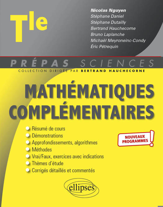 Cet ouvrage est destiné aux élèves de Terminale qui ont choisi l’option Mathématiques complémentaires. Tout en suivant strictement le programme proposé aux élèves, cet ouvrage l'appréhende différemment. Il aide à comprendre les méthodes de raisonnement et de résolution età modéliser les phénomènes physiques, biologiques ou économiques.