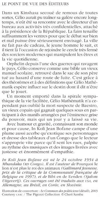 Dans un Kinshasa secoué de remous de toutes sortes, Célio aurait pu traîner sa galère encore longtemps, n'eût été sa rencontre avec le directeur d'un bureau aux activités très confidentielles, attaché à la présidence de la République. La faim tenaille suffisamment les ventres pour que le débat sur bien et mal puisse être sérieusement envisagé. La ville ne fait pas de cadeau, le jeune homme le sait, et il tient là l'occasion de rejoindre le cercle très fermé des sorciers modernes qui manipulent les êtres et la vie quotidienne. Orphelin depuis l'une des guerres qui ravagent le pays, Célio conserve comme une bible un vieux manuel scolaire, retrouvé dans le sac de son père tué au hasard d'une route de fuite. C'est grâce à des théorèmes et à des définitions que Célio Mathématik espère influer sur le destin dont il dit n'être que le jouet. Un moment emporté dans la spirale sympathique de la vie facilitée, Célio Mathématik n'a cependant pas oublié la mort suspecte de Baestro, un vieux copain qui gagnait quelques sous en participant à des manifs arrangées par l'éminence grise du pouvoir, mais qui un jour y a laissé sa vie. Avec humour et gravité, connaissant son monde et pour cause, In Koli Jean Bofane campe d'une plume aussi acerbe qu'exotique ses personnages et dresse des tableaux d'un Congo que le lecteur s'approprie vite parce qu'il sent les rues, palpite au rythme des musiques et des images livrées avec justesse et énormément d'empathie. In Koli Jean Bofane est né le 24 octobre 1954 à Mbandaka (RD Congo). Il est l'auteur de Pourquoi le lion n'est plus le roi des animaux (Gallimard Jeunesse, prix de la critique de la Communauté française de Belgique en 1997), et de Bibi en de Eenden (Sjalom Uitgeverij). Ces ouvrages ont été traduits aux USA, en Allemagne, au Brésil, en Corée, en Slovénie.