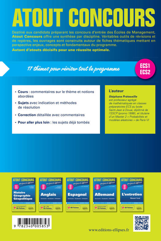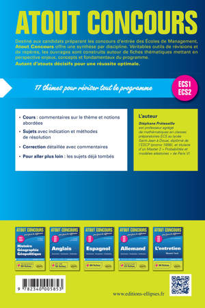 Destiné aux candidats préparant les concours d’entrée des Écoles de Management, Atout Concours offre une synthèse par discipline. Véritables outils de révisions et de repères, les ouvrages sont construits autour de fiches thématiques mettant en perspective enjeux, concepts et fondamentaux du programme.