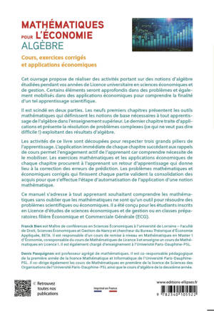 Cet ouvrage propose de réaliser des activités portant sur des notions d’algèbre étudiées en Licence universitaire en sciences économiques et de gestion. Certains éléments seront approfondis dans des problèmes et également mobilisés dans des applications économiques pour comprendre la finalité d’un tel apprentissage scientifique. Il est scindé en deux parties :