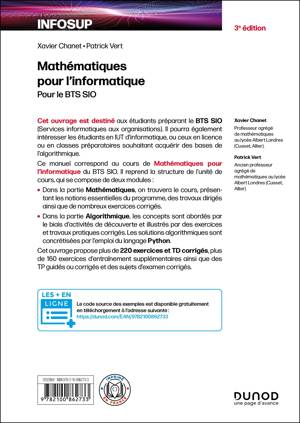 Ce manuel correspond au cours de Mathématiques pour l’informatique du BTS SIO. Il reprend la structure de l’unité de cours, qui se compose de deux modules :
