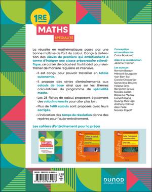 Ce cahier de calcul a été conçu par une trentaine de professeurs de mathématiques de lycée et de classes préparatoiresà l'intention des élèves de première spécialité maths pour leur permettre de s'entraîner au calcul en toute autonomie. La technique et le calcul sont fondamentaux pour appréhender les questions mathématiques. De même que l’on doit faire des gammes et beaucoup pratiquer lorsque l’on apprend un instrument, on doit calculer régulièrement lorsque l’on apprend les mathématiques, et plus particulièrement lesélèves de première qui ambitionnent d'intégrer une classe préparatoire scientifique. Ce cahier est construit sous forme de 28 fiches contenant plus de 1400 calculs qui couvrent à la fois les calculs de base et les thèmes calculatoires du programme de spécialité maths. Les exercices sont tous proposés avec leurs corrigés. Des indications de temps de résolution donnent des repères pour l'auto-entraînement.
