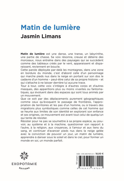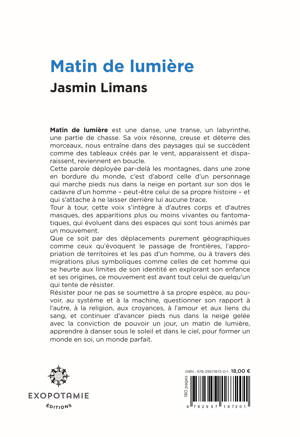 Matin de lumière est un recueil de poésie qui regroupe quatre textes en première partie, et le texte principal en seconde partie, qui a donné son titre au livre. Ce second texte qui est une danse, une transe, un labyrinthe, une partie de chasse, nous entraîne dans des paysages qui se succèdent comme des tableaux créés par le vent, apparaissent et disparaissent, reviennent en boucle. La parole qui s'y déploie, est d’abord celle d’un personnage qui marche pieds nus dans la neige en portant sur son dos le cadavre d'un homme – peut-être celui de sa propre histoire – en s’attachant à ne laisser derrière lui aucune trace. Tour à tour, cette voix s’intègre à d’autres corps et d’autres masques, des apparitions plus ou moins vivantes ou fantomatiques, qui évoluent dans des espaces qui sont tous animés par un mouvement. Que ce soit par des déplacements purement géographiques comme ceux qu’évoquent le passage de frontières, l’appropriation de territoires et les pas d’un homme, ou à travers des migrations plus symboliques comme celles de cet homme qui se heurte aux limites de son identité en explorant son enfance et ses origines, ce mouvement est avant tout celui de quelqu’un qui tente de résister. Résister pour ne pas se soumettre à sa propre espèce, au pouvoir, au système et à la machine, questionner son rapport à l'autre, à la religion, aux croyances, à l'amour et aux liens du sang, et continuer d’avancer pieds nus dans la neige gelée avec la conviction de pouvoir un jour, un matin de lumière, apprendre à danser sous le soleil et dans le ciel, pour former un monde en soi, un monde parfait.