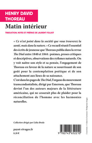 Une intense méditation du jeune Thoreau (1817-1862), mêlant poésie, observation naturaliste et réflexion éthique, sur l'harmonie du monde naturel et la relation que l'homme doit restaurer avec celui-ci, en résistant aux sirènes de la civilisation.