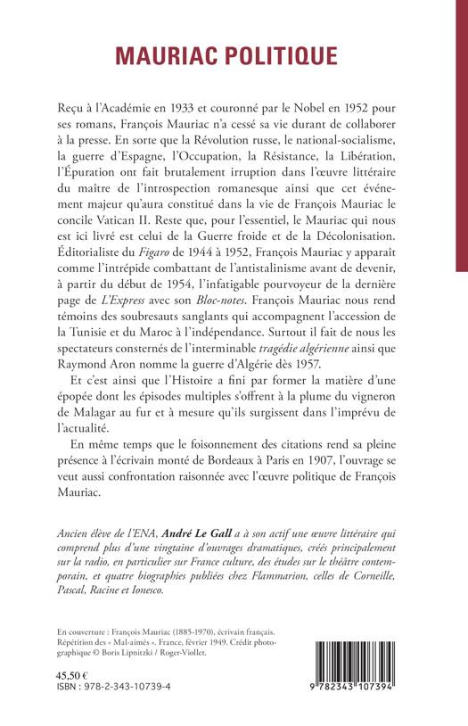 Reçu à l'Académie en 1933 et couronné par le Nobel en 1952 pour ses romans, François Mauriac n'a cessé sa vie durant de collaborer avec la presse. En sorte que la Révolution russe, le national-socialisme, l'Occupation ou la guerre d'Espagne ont fait brutalement irruption dans l'œuvre littéraire du maître de l'introspection romanesque. Le Mauriac livré dans cet ouvrage, qui est celui de la Guerre froide et de la Décolonisation, apparaît entre autres comme l'intrépide combattant de l'antistalinisme. Ainsi, en même temps que le foisonnement des citations rend sa pleine présence à l'écrivain, l'ouvrage se veut aussi confrontation raisonnée avec son œuvre politique.