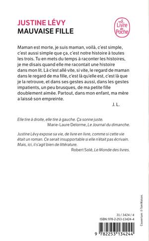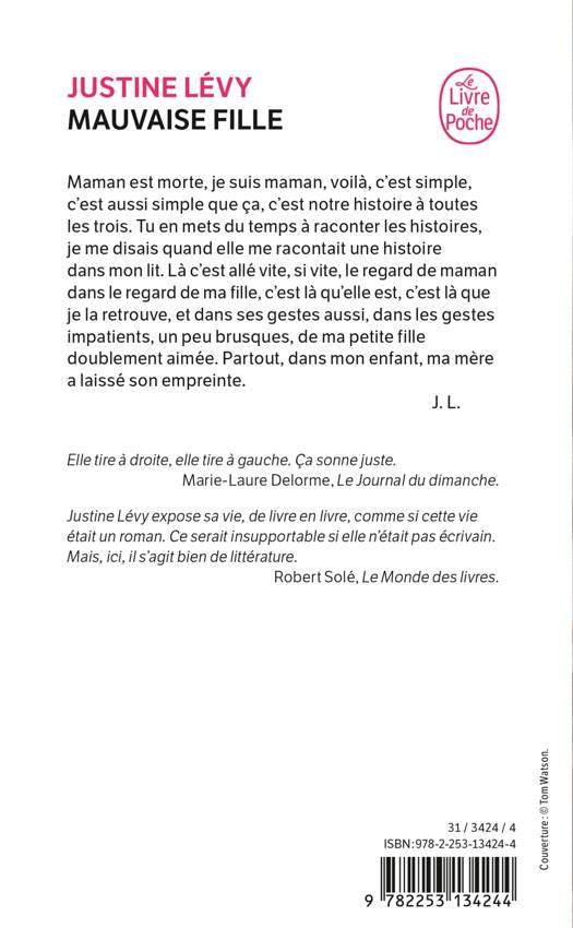 Maman est morte, je suis maman, voilà, c'est simple, c'est aussi simple que ça, c'est notre histoire à toutes les trois. Tu en mets du temps à raconter les histoires, je me disais quand elle me racontait une histoire dans mon lit. Là c'est allé vite, si vite, le regard de maman dans le regard de ma fille, c'est là qu'elle est, c'est là que je la retrouve, et dans ses gestes aussi, dans les gestes impatients, un peu brusques, de ma petite fille doublement aimée. [ ...]. Partout, dans mon enfant, ma mère a laissé son empreinte. J. L.Une fois de plus, Justine Lévy se livre avec talent à une confession émouvante et impudique. [...] un mélange d'acidité et d'humour. Robert Solé, Le Monde des livres.Justine Lévy rejoint l'une des plus anciennes vocations de la littérature: celle de soulager par les mots les vies meurtries et les destins foudroyés. Alexis Lacroix, Marianne.