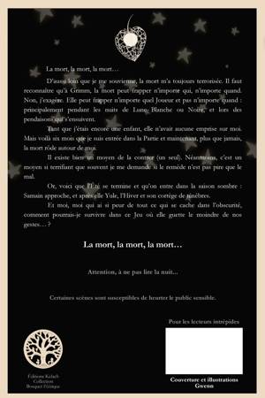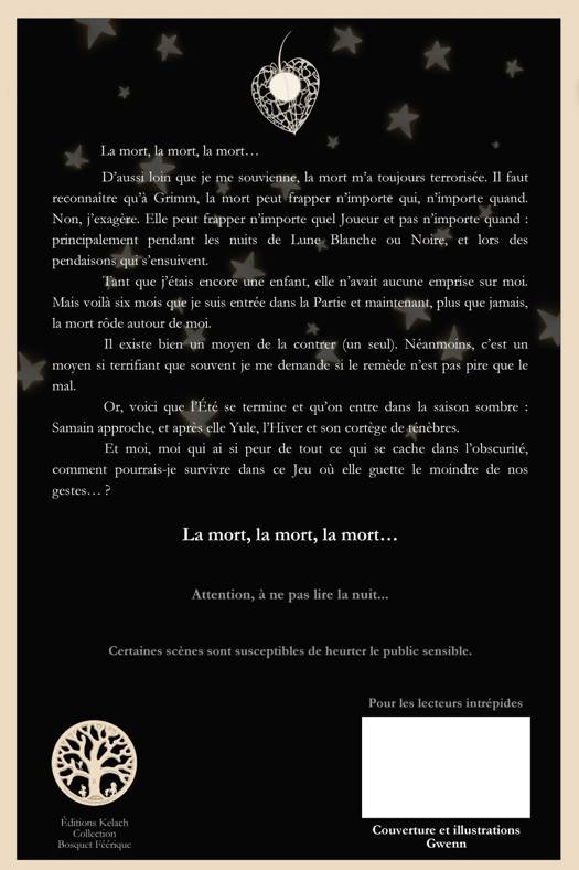 La mort, la mort, la mort... D'aussi loin que je me souvienne, la mort m'a toujours terrorisée. Il faut reconnaître qu'à Grimm, la mort peut frapper n'importe qui, n'importe quand. Non, j'exagère. Elle peut frapper n'importe quel Joueur et pas n'importe quand : principalement pendant les nuits de Lune Blanche ou Noire, et lors des pendaisons qui s'ensuivent. Tant que j'étais encore une enfant, elle n'avait aucune emprise sur moi. Mais voilà six mois que je suis entrée dans la Partie et maintenant, plus que jamais, la mort rôde autour de moi. Il existe bien un moyen de la contrer (un seul). Néanmoins, c'est un moyen si terrifiant que souvent je me demande si le remède n'est pas pire que le mal. Or, voici que l'Été se termine et qu'on entre dans la saison sombre : Samain approche, et après lui Yule, l'Hiver et son cortège de ténèbres. Et moi, moi qui ai si peur de tout ce qui se cache dans l'obscurité, comment pourrais-je survivre dans ce Jeu où elle guette le moindre de nos gestes... ? La mort, la mort, la mort...