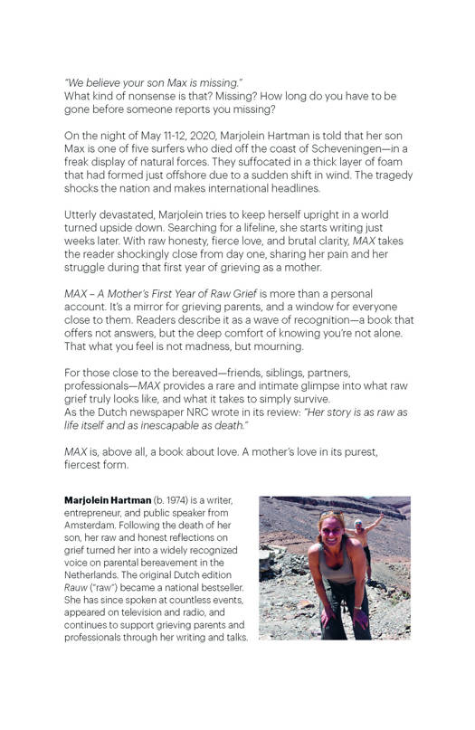 Utterly devastated, Marjolein tries to keep herself upright in a world turned upside down. Searching for a lifeline, she starts writing just weeks later. With raw honesty, fierce love, and brutal clarity, MAX takes the reader shockingly close from day one, sharing her pain and her struggle during that first year of grieving as a mother.