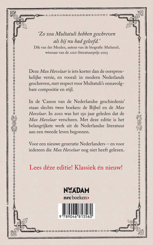 Multatuli (alias Eduard Douwes Dekker, 1820-1887) was niet zomaar een schrijver. Max Havelaar, zijn eerste werk, was meteen een meesterwerk. Met deze hertaling van NRCredacteur Gijsbert van Es kan het belangrijkste boek uit de Nederlandse literatuur aan een tweede leven beginnen. Deze editie is iets korter dan de oorspronkelijke en vooral: in modern Nederlands geschreven, met respect voor Multatuli's onnavolgbare compositie en stijl. Voor een nieuwe generatie Nederlanders - en voor iedereen die Max Havelaar nog niet gelezen heeft.