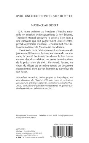 1923. Jeune assistant au Muséum d'histoire naturelle en mission océanographique à Port-Etienne, Théodore Monod découvre le désert : il se joint à une caravane qui doit gagner Saint-Louis et entreprend sa première méharée — environ huit cents kilomètres à travers la Mauritanie occidentale.