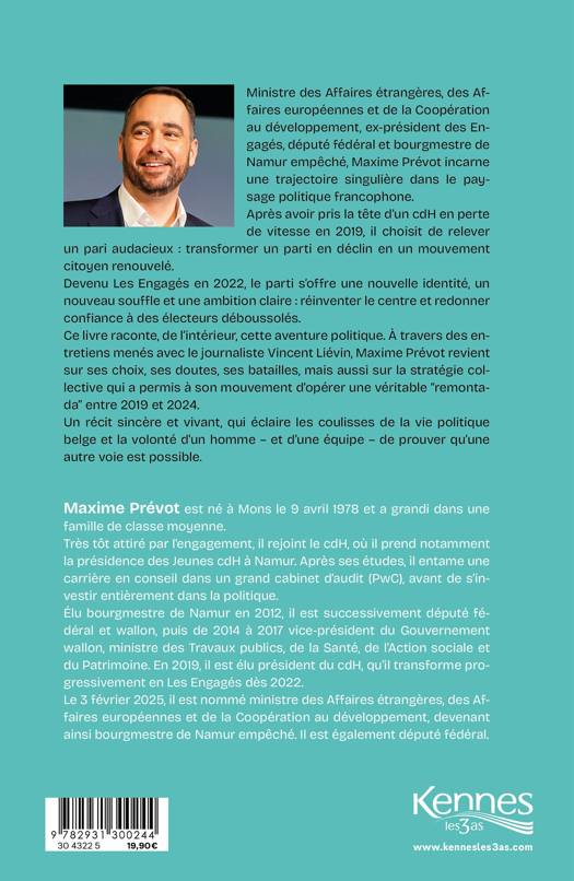 Ministre des Affaires étrangères, ex-président des Engagés, député fédéral et bourgmestre de Namur empêché, Maxime Prévot incarne une trajectoire singulière dans le paysage politique francophone. Après avoir pris la tête d’un cdH en perte de vitesse en 2019, il choisit de relever un pari audacieux : transformer un parti en déclin en un mouvement citoyen renouvelé. Devenu Les Engagés en 2022, le parti s’offre une nouvelle identité, un nouveau souffle et une ambition claire : réinventer le centre et redonner confiance à des électeurs déboussolés. Ce livre raconte, de l’intérieur, cette aventure politique. À travers des entretiens menés avec le journaliste Vincent Liévin, Maxime Prévot revient sur ses choix, ses doutes, ses batailles, mais aussi sur la stratégie collective qui a permis à son mouvement d’opérer une véritable “remontada” entre 2019 et 2024. Un récit sincère et vivant, qui éclaire les coulisses de la vie politique belge et la volonté d’un homme – et d’une équipe – de prouver qu’une autre voie est possible.