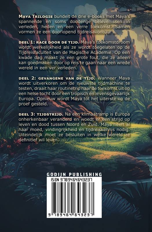Maya Trilogie bundelt de drie e-books met Maya’s spannende en soms doodenge belevenissen in verleden, heden en een verre toekomst. Samen vormen ze een doorlopend tijdreisavontuur … * Deel 1: Race door de tijd. Maya’s toekomstdroom wordt werkelijkheid als ze wordt toegelaten op de Tijdreisfaculteit van de Magische Academie. Op een kwade dag maakt ze een grote fout, die ze alleen kan goedmaken door op reis te gaan naar een wrede wereld in een ver verleden. * Deel 2: Gevangene van de tijd. Wanneer Maya wordt uitverkoren om de nieuwste tijdmachine te testen, draait haar routinetrip naar de toekomst uit op een helse tocht door een tropisch en levensgevaarlijk Europa. Opnieuw wordt Maya tot het uiterste op de proef gesteld. * Deel 3: Tijdstrijd. Na een klimaatramp is Europa onherkenbaar veranderd en woedt er een strijd op leven en dood tussen Noord en Zuid. Maya heeft al haar moed, vindingrijkheid en tijdreiskennis nodig. Uiteindelijk moet ze besluiten in welke wereld ze definitief wil leven.