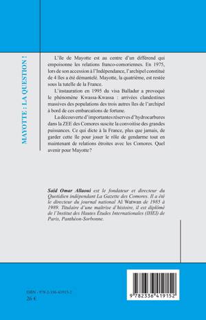 L'île de Mayotte est au centre d'un différend qui empoisonne les relations franco-comoriennes. En 1975, lors de son accession à l'Indépendance, l'archipel constitué de 4 îles a été démantelé. Mayotte, la quatrième, est restée sous la tutelle de la France. L'instauration en 1995 du visa Balladur a provoqué le phénomène Kwassa-Kwassa arrivées clandestines massives des populations des trois autres îles de l'archipel à bord de ces embarcations de fortune. La découverte d'importantes réserves d'hydrocarbures dans la ZEE des Comores suscite la convoitise des grandes puissances. Ce qui dicte à la France, plus que jamais, de garder cette île pour jouer le rôle de gendarme tout en maintenant de relations étroites avec les Comores. Quel avenir pour Mayotte ?