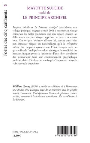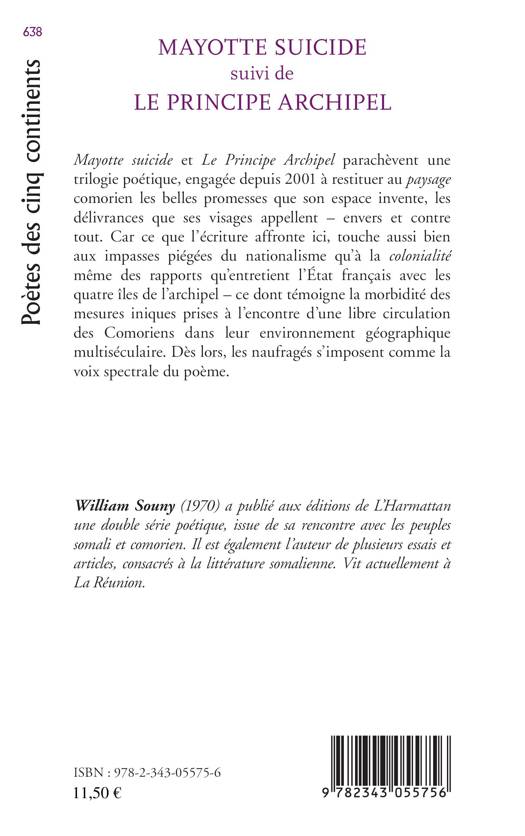 Mayotte suicide et Le pincipe Archipel parachèvent une trilogie poétique, engagée depuis 2001 à restituer au paysage comorien les belles promesses que son espace invente, les délivrances que ses visages appellent - envers et contre tout.