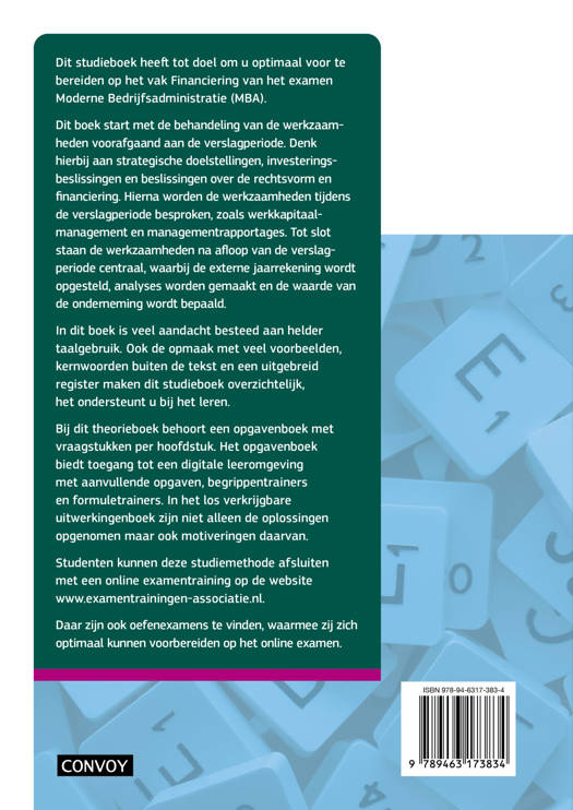 Dit studieboek heeft tot doel om u optimaal voor te bereiden op het vak Financiering van het examen Moderne Bedrijfsadministratie (MBA). Dit boek start met de behandeling van de werkzaamheden voorafgaand aan de verslagperiode. Denk hierbij aan strategische doelstellingen, investeringsbeslissingen en beslissingen over de rechtsvorm en financiering. Hierna worden de werkzaamheden tijdens de verslagperiode besproken, zoals werkkapitaalmanagement en managementrapportages. Tot slot staan de werkzaamheden na afloop van de verslagperiode centraal, waarbij de externe jaarrekening wordt opgesteld, analyses worden gemaakt en de waarde van de onderneming wordt bepaald.