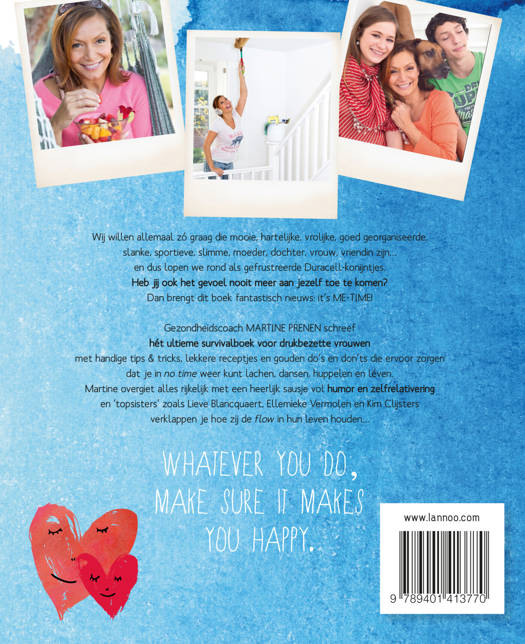 Martine Prenen schrijft handleiding voor drukbezette vrouwen Wij willen allemaal zó graag die mooie, hartelijke, vrolijke, goed georganiseerde, slanke, sportieve, slimme, moeder, dochter, vrouw, vriendin zijn... en dus lopen we rond als gefrustreerde Duracell-konijntjes. Heb jij ook het gevoel nooit meer aan jezelf toe te komen? Dan brengt dit boek fantastisch nieuws: it's ME-TIME! Gezondheidscoach Martine Prenen schreef hét ultieme survivalboek voor drukbezette vrouwen met handige tips & tricks, lekkere receptjes en gouden do's en don'ts die ervoor zorgen dat je in no time weer kunt lachen, dansen, huppelen en léven. Martine overgiet alles rijkelijk met een heerlijk sausje vol humor en zelfrelativering en 'topsisters' zoals Lieve Blancquaert, Ellemieke Vermolen en Kim Clijsters verklappen je hoe zij de flow in hun leven houden... Whatever you do, make sure it makes you happy.