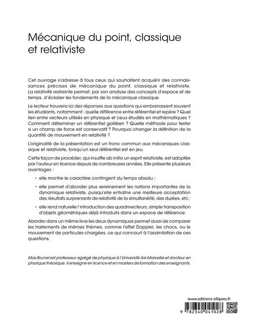 Cet ouvrage s’adresse à tous ceux qui souhaitent acquérir des connaissances précises de mécanique du point, classique et relativiste : étudiants de licence L1, L2, L3 et de classes préparatoires, candidats aux concours d’enseignement (CAPES, agrégation externe et interne), formation continue.