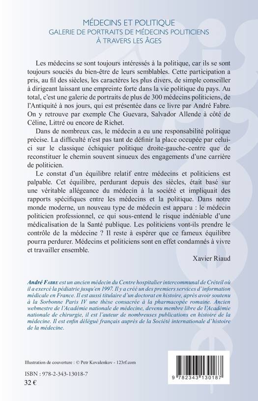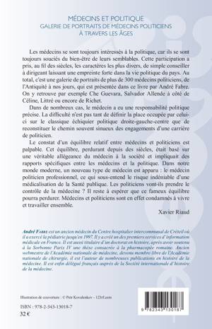 Les médecins se sont toujours intéressés à la politique. Cette participation a pris, au fil des siècles, les caractères les plus divers, de simple conseiller à dirigeant laissant une empreinte forte dans la vie politique du pays. C'est une galerie de portraits de plus de 300 médecins politiciens, de l'Antiquité à nos jours (de Che Guevara, à Céline et Littré), qui est présentée dans ce livre. Les politiciens vont-ils prendre le contrôle de la médecine ? Médecins et politiciens sont en effet condamnés à travailler ensemble.