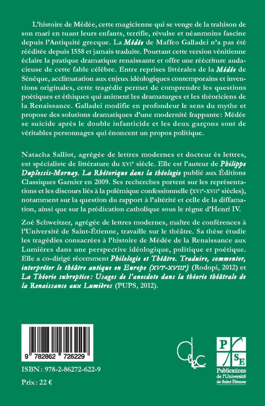 L'histoire de Médée, cette magicienne qui se venge de la trahison de son mari en tuant leurs enfants, terrifie, révulse et néanmoins fascine depuis l'Antiquité grecque. La Médée de Maffeo Galladei n'a pas été rééditée depuis 1558 et jamais traduite. Pourtant cette version vénitienne éclaire la pratique dramatique renaissante et offre une réécriture audacieuse de cette fable célèbre. Entre reprises littérales de la Médée de Sénèque, acclimatation aux enjeux idéologiques contemporains et inventions originales, cette tragédie permet de comprendre les questions poétiques et éthiques qui animent les dramaturges et les théoriciens de la Renaissance. Galladei modifie en profondeur le sens du mythe et propose des solutions dramatiques d'une modernité frappante : Médée se suicide après le double infanticide et les deux garçons sont de véritables personnages qui énoncent un propos politique.