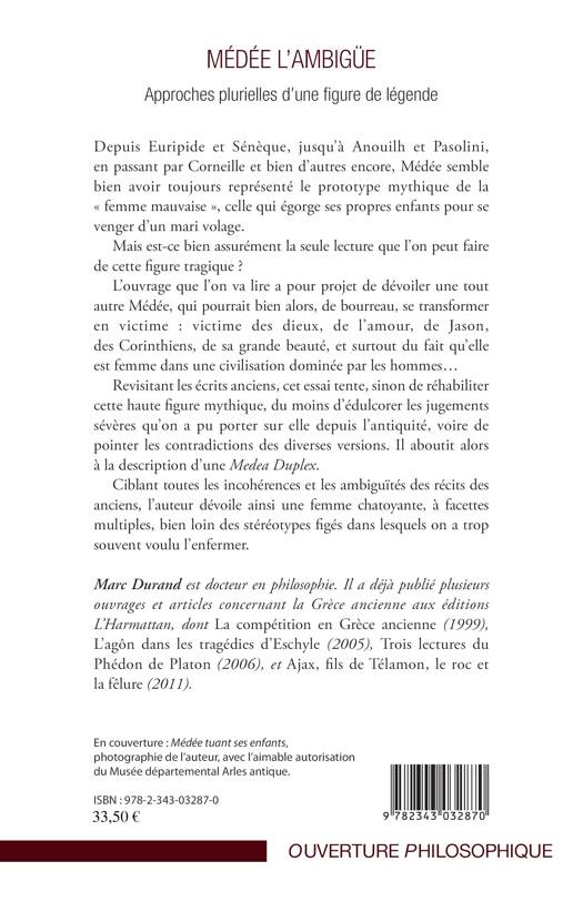 Depuis toujours Médée semble bien avoir représenté le prototype mythique de la « femme mauvaise », celle qui égorge ses propres enfants pour se venger d'un mari volage. Mais est-ce bien assurément la seule lecture que l'on peut faire de cette figure tragique ? Revisitant les écrits anciens, cet essai tente, sinon de réhabiliter cette haute figure mythique, du moins d'édulcorer les jugements sévères qu'on a pu porter sur elle depuis l'antiquité, voire de pointer les contradictions des diverses versions.