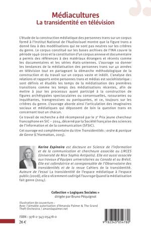 L'étude de la construction médiatique des transidentités (transgenres, transsexes, etc.) sur 40 années de télévision grâce aux archives de l'INA, s'intéresse aux modélisations sociales et médiatiques dont les personnes sont l'objet. L'auteure décrit un travail sur corpus et dessine les contours des archétypes, en articulant les notions d'imaginaires social et médiatique. Les modélisations semblent produire des effets identitaires sur l'ensemble de la société. Ce travail est complémentaire du titre Transidentités : ordre & panique de Genre, édité simultanément.