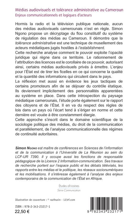 Hormis la radio et la télévision publique nationale, aucun des médias audiovisuels camerounais n’est en règle. Simon Ngono propose un décryptage du flou constitutif du système de régulation des médias au Cameroun. Il démontre que la tolérance administrative est une technique de musellement des acteurs médiatiques jugés hostiles à l’establishment. Cette recherche analyse comment le pouvoir exploite l’opacité juridique qui règne dans ce territoire et met aussi en évidence les jeux tactiques de certains promoteurs afi n de se déjouer du contrôle étatique.