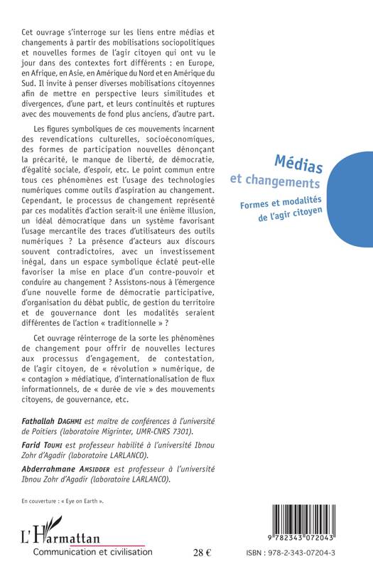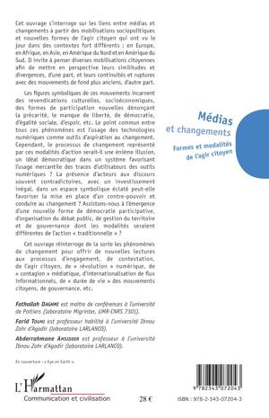 Cet ouvrage s'interroge sur les liens entre médias et changements à partir des mobilisations sociopolitiques et nouvelles formes de l'agir citoyen qui ont vu le jour dans des contextes fort différents : en Europe, en Afrique, en Asie, en Amérique du Nord et en Amérique du Sud. Il réinterroge les phénomènes de changement pour offrir de nouvelles lectures aux processus d'engagement, de contestation, de l'agir citoyen, de révolution numérique, de contagion médiatique, d'internationalisation de flux informationnels...