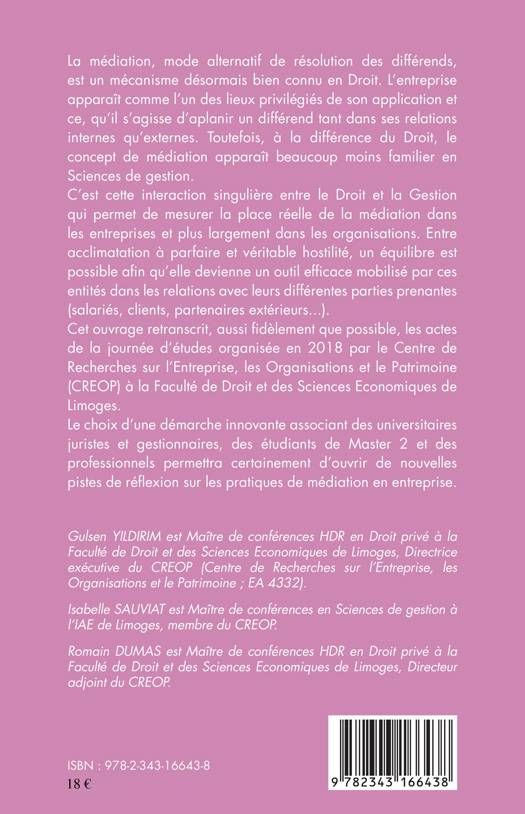 La médiation, mode alternatif de résolution des différends, est un mécanisme désormais bien connu en Droit. L'entreprise apparaît comme l'un des lieux privilégiés de son application et ce, qu'il s'agisse d'aplanir un différend tant dans ses relations internes qu'externes. Toutefois, à la différence du Droit, le concept de médiation apparaît beaucoup moins familier en Sciences de gestion. C'est cette interaction singulière entre Droit et Gestion qui permet de mesurer la place réelle de la médiation dans les entreprises et les organisations. Entre acclimatation à parfaite et hostilité, un équilibre est possible afin qu'elle devienne un outil efficace.