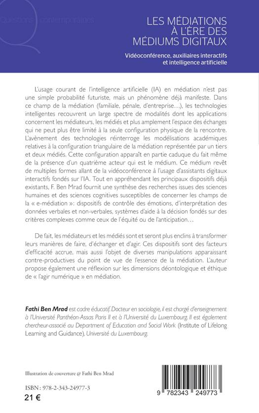 L’auteur se propose d’étudier les impacts potentiels ou déjà manifestes de l’intelligence artificielle dans le champ de la médiation (familiale, entreprise, sociale..). Il fournit une synthèse des recherches issus des sciences humaines et des sciences cognitives concernant les champs de la « e-médiation » : vidéoconférence, assistance digitale et médiation automatisée. Il interroge les fonctions de ces dispositifs intelligents et les nouvelles formes de l’agir numérique. Celles-ci préfigurent, au-delà des innovations techniques à venir, des modalités spécifiques d’exercice professionnelle qui ne peut plus être limité à la seule configuration physique de la rencontre.