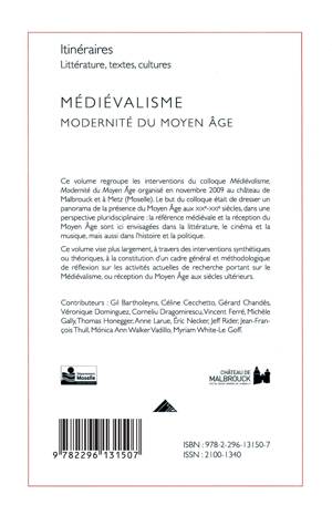 Ce volume regroupe les interventions du colloque Médiévalisme, Modernité du Moyen Âge organisé en novembre 2009 au château de Malbrouck et à Metz (Moselle). Le but du colloque était de dresser un panorama de la présence du Moyen Âge au XIXe - XXe siècles, dans une perspective pluridisciplinaire : la référence mediévale et la réception du Moyen Âge sont ici envisagées dans la littérature, le cinéma et la musique, mais aussi dans l'histoire et la politique.