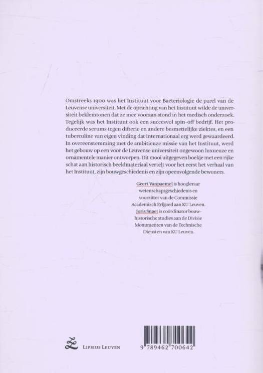 Het verhaal van een bijzonder bouwwerk. Omstreeks 1900 was het Instituut voor Bacteriologie de parel van de Leuvense universiteit. Met de oprichting van het Instituut wilde de universiteit beklemtonen dat ze mee vooraan stond in het medisch onderzoek. Tegelijk was het Instituut ook een succesvol spin-offbedrijf. Het produceerde serums tegen difterie en andere besmettelijke ziektes, en een tuberculine van eigen vinding dat internationaal erg werd gewaardeerd. In overeenstemming met de ambitieuze missie van het Instituut, werd het gebouw op een voor de Leuvense Universiteit ongewoon luxueuze en ornamentele manier ontworpen. Dit mooi uitgegeven boekje met een rijke schat aan historisch beeldmateriaal vertelt voor het eerst het verhaal van het Instituut, zijn bouwgeschiedenis en zijn opeenvolgende bewoners.