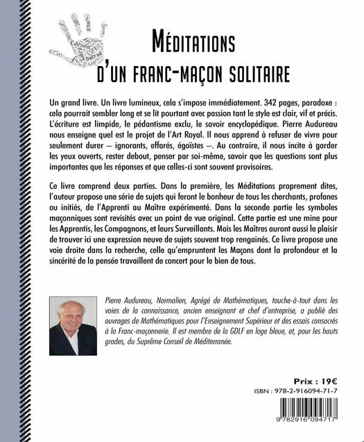 Ce livre comprend deux parties. Dans la première, les Méditations proprement dites, l'auteur propose une série de sujets qui feront le bonheur de tous les cherchants, profanes ou initiés, de l'Apprenti au Maître expérimenté. Dans la seconde partie les symboles maçonniques sont revisités avec un point de vue original. Cette partie est une mine pour les Apprentis, les Compagnons, et leurs Surveillants. Mais les Maîtres auront aussi le plaisir de trouver ici une expression neuve de sujets souvent trop rengainés. Ce livre propose une voie droite dans la recherche, celle qu'empruntent les Maçons dont la profondeur et la sincérité de la pensée travaillent de concert pour le bien de tous.