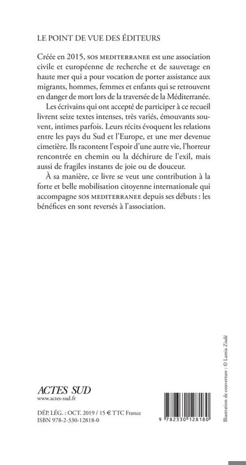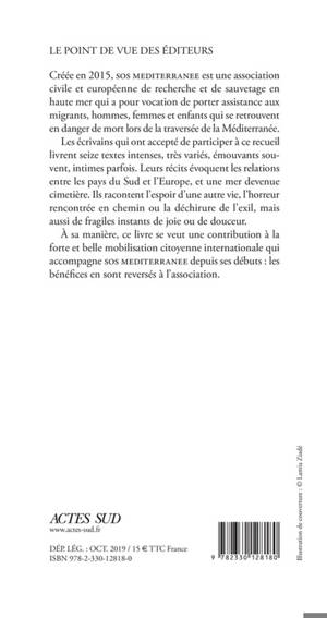 Créée en 2015, SOS MEDITERRANEE est une association civile et européenne de recherche et de sauvetage en haute mer qui a pour vocation de porter assistance aux migrants, hommes, femmes et enfants qui se retrouvent en danger de mort lors de la traversée de la Méditerranée. Les écrivains qui ont accepté de participer à ce recueil livrent seize textes intenses, très variés, émouvants sou- vent, intimes parfois. Leurs récits évoquent les relations entre les pays du Sud et l'Europe, et une mer devenue cimetière. Ils racontent l'espoir d'une autre vie, l'horreur rencontrée en chemin ou la déchirure de l'exil, mais aussi de fragiles instants de joie ou de douceur. À sa manière, ce livre se veut une contribution à la forte et belle mobilisation citoyenne internationale qui accompagne SOS MEDITERRANEE depuis ses débuts : les bénéfices en sont reversés à l'association.