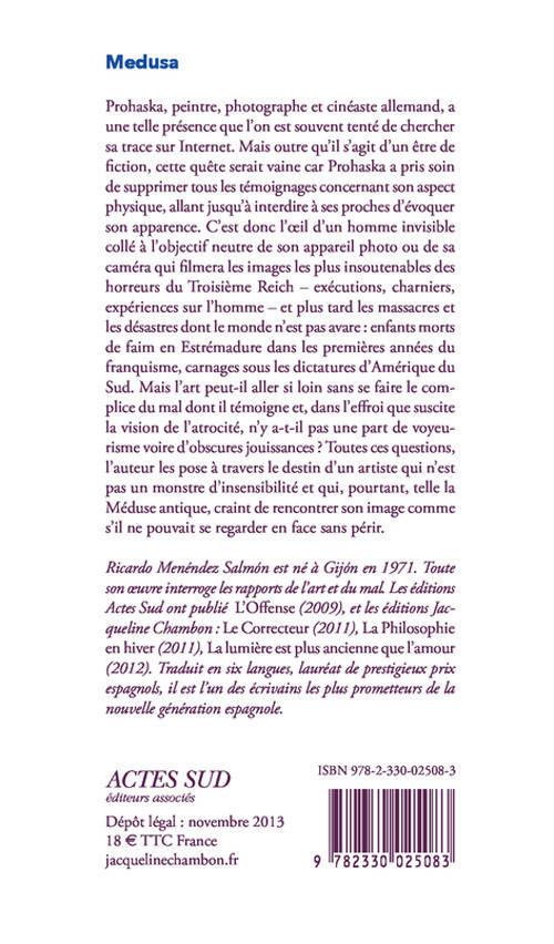 Prohaska, peintre, photographe et cinéaste allemand, a une telle présence que l'on est souvent tenté de chercher sa trace sur Internet. Mais outre qu'il s'agit d'un être de fiction, cette quête serait vaine car Prohaska a pris soin de supprimer tous les témoignages concernant son aspect physique, allant jusqu'à interdire à ses proches d'évoquer son apparence. C'est donc l'oeil d'un homme invisible collé à l'objectif neutre de son appareil photo ou de sa caméra qui filmera les images les plus insoutenables des horreurs du Troisième Reich - exécutions, charniers, expériences sur l'homme - et plus tard les massacres et les désastres dont le monde n'est pas avare : enfants morts de faim en Estrémadure dans les premières années du franquisme, carnages sous les dictatures d'Amérique du Sud. Mais l'art peut-il aller si loin sans se faire le complice du mal dont il témoigne et, dans l'effroi que suscite la vision de l'atrocité, n'y a-t-il pas une part de voyeurisme voire d'obscures jouissances ? Toutes ces questions, l'auteur les pose à travers le destin d'un artiste qui n'est pas un monstre d'insensibilité et qui, pourtant, telle la Méduse antique, craint de rencontrer son image comme s'il ne pouvait se regarder en face sans périr.