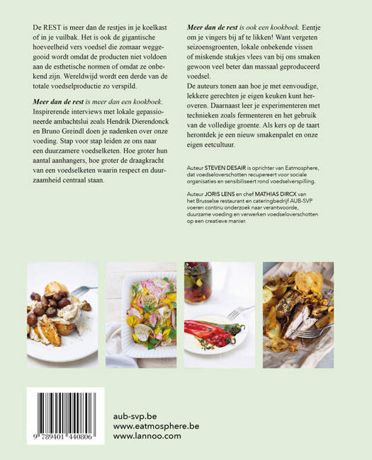 Meer dan de rest is ook een kookboek. Eentje om je vingers bij af te likken! Want vergeten seizoensgroenten, lokale onbekende vissen of miskende stukjes vlees van bij ons smaken gewoon veel beter dan massaal geproduceerd voedsel. De auteurs tonen aan hoe je met eenvoudige, lekkere gerechten je eigen keuken kunt heroveren. Daarnaast leer je experimenteren met technieken zoals fermenteren en het gebruik van de volledige groente. Als kers op de taart herontdek je een nieuw smakenpalet en onze eigen eetcultuur.