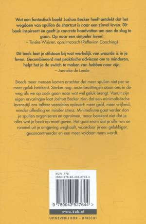 'Meer door minder' is een inspirerend boek van Joshua Becker over het creëren van ruimte in je huis, je leven, je hoofd en je bezit. Becker laat zien dat een minimalistische levensstijl geworteld is in eeuwenoude theorieën en methodes over afstand doen van bezit. Door alle ruis en rommel uit zijn omgeving weg te halen, is Becker een gelukkiger, geconcentreerder en een meer tevreden mens geworden. Het opruimen van alles wat overbodig is geeft letterlijk en figuurlijk ruimte in je leven!