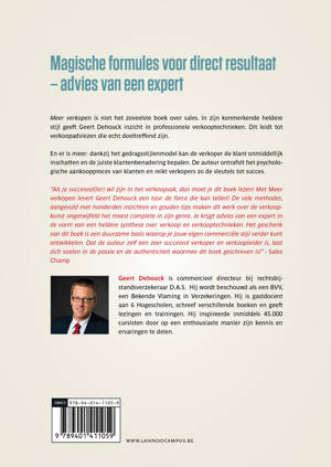 Magische formules voor direct resultaat Welke verkooptechnieken hebben de meeste impact? Hoe begeleid ik mensen tot een aankoop? Wat met nazorg? Meer verkopen is niet het zoveelste boek over sales. In zijn kenmerkende heldere stijl geeft de auteur inzicht in professionele verkooptechnieken en geeft hij verkoopadviezen die echt doeltreffend zijn. Maar er is meer: dankzij het gedragstijlenmodel kan de verkoper de klant onmiddellijk inschatten en de juiste klantenbenadering bepalen. De auteur ontrafelt het psychologisch aankoopproces van klanten en reikt verkopers op basis daarvan de sleutels tot succes. 'Als je succesvol(ler) wil zijn in het verkoopvak dan moet je dit boek lezen! Met zijn boek levert Geert Dehouck een tour de force die kan tellen! De vele methodes, aangevuld met honderden inzichten en gouden tips maken dit werk over de verkoopkunst ongetwijfeld het meest complete in zijn genre. Je krijgt advies van een expert in de vorm van een heldere synthese over verkoop en verkooptechnieken. Het geschenk van dit boek is een duurzame basis waarop je jouw eigen commerciële stijl verder kunt ontwikkelen. Dat de auteur zelf een zeer succesvol verkoper en verkoopleider is, laat zich voelen in de passie en de authenticiteit waarmee dit boek geschreven is!'. Sales Champ