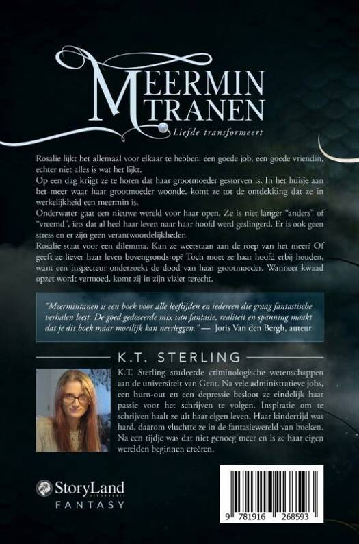 Rosalie lijkt het allemaal voor elkaar te hebben: een goede job, een goede vriendin, echter niet alles is wat het lijkt. Op een dag krijgt ze te horen dat haar grootmoeder gestorven is. In het huisje aan het meer waar haar grootmoeder woonde, komt ze tot de ontdekking dat ze in werkelijkheid een meermin is. Onderwater gaat een nieuwe wereld voor haar open. Ze is niet langer “anders” of “vreemd”, iets dat al heel haar leven naar haar hoofd werd geslingerd. Er is ook geen stress en er zijn geen verantwoordelijkheden. Rosalie staat voor een dilemma. Kan ze weerstaan aan de roep van het meer? Of geeft ze liever haar leven bovengronds op? Toch moet ze haar hoofd erbij houden, want een inspecteur onderzoekt de dood van haar grootmoeder. Wanneer kwaad opzet wordt vermoed, komt zij in zijn vizier terecht.K.T. Sterling studeerde criminologische wetenschappen aan de universiteit van Gent. Na vele administratieve jobs, een burn-out en een depressie besloot ze eindelijk haar passie voor het schrijven te volgen. Inspiratie om te schrijven haalt ze uit haar eigen leven. Haar kindertijd was hard, daarom vluchtte ze in de fantasiewereld van boeken. Na een tijdje was dat niet genoeg meer en is ze haar eigen werelden beginnen creëren. Na enkele publicaties in verhalenbundels, een boek in eigen beheer uitgegeven samen met een medeauteur, is Meermintranen haar debuutroman.