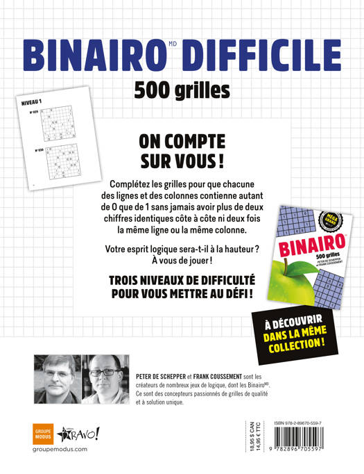 Complétez les grilles pour que chacune des lignes et des colonnes contienne autant de 0 que de 1 sans jamais avoir plus de deux chiffres identiques côte à côte ni deux fois la même ligne ou la même colonne.