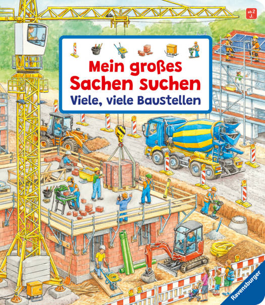 Hier darf in Ruhe zugeschaut werden: Das Baustellenbuch der Extraklasse zeigt nicht nur bekannte Szenen wie den Hausbau und den Straßenbau. Hier gibt es noch viel mehr zu entdecken. Eine Baustelle im Bahnhof und am Flughafen, Windräder werden aufgestellt und eine Museumsfassade saniert. Auch die Abrisszange ist in der Altstadt unterwegs und sicher am besten: Ein neuer Spielplatz wird gebaut. Detailreich illustrierte und gut recherchierte Baustellenbilder laden zum gemeinsamen Betrachten ein. Kleine Suchbilder am Rand fordern dazu auf, sich auch alleine mit den Bildern zu beschäftigen. So abwechslungsreich sind die Bilder, dass sich der kleine Baustellenfan sicher nicht für eine Lieblingsseite entscheiden kann. Wo immer sich ein Kran dreht, dort möchten Kinder und Erwachsene gerne zusehen. Auf 11 großformatigen Wimmelbildern gibt es nicht nur viel zu sehen, hier kann auch viel Neues dazu gelernt werden. Der begleitende Text fordert immer mit einem Suchauftrag dazu auf, die kleinen Bilder am Rand im Schaubild wiederzufinden. Die Beschriftungen unter den Suchbildern helfen dabei, Fahrzeuge und Werkzeuge zu benennen. Das unterstützt den Spracherwerb. Das Suchen vertieft die Beschäftigung mit den Bildern. Ein Familien-Baustellenbuch für große und kleine Bauherren.