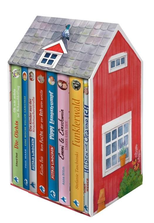 Lust auf einen Besuch in der Villa Kunterbunt oder in der Krachmacherstraße? Oder vielleicht auf eine Reise in den Funklerwald, nach Schmuddelfing oder in die Wohnung von Herrn Taschenbier? Ob Pippi, das Sams oder die Olchis, dieser besondere Schuber hat Platz für acht wundervolle Kinderbücher von großartigen Autorinnen und Autoren wie Astrid Lindgren, Paul Maar, Kirsten Boie oder Erhard Dietl. In Form eines Schwedenhauses gestaltet, lässt sich der leere Schuber außerdem als Spielhaus nutzen und bietet noch mehr Raum für Fantasie!