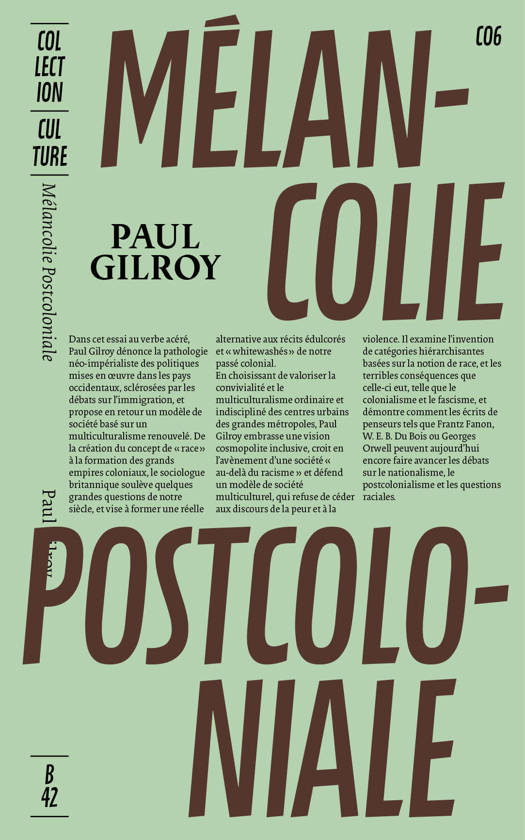 Dans cet essai au verbe acéré, Paul Gilroy dénonce la pathologie néo-impérialiste des politiques mises en œuvre dans les pays occidentaux, sclérosées par les débats sur l’immigration, et propose en retour un modèle de société basé sur un multiculturalisme renouvelé. De la création du concept de « race » à la formation des grands empires coloniaux, le sociologue britannique soulève quelques grandes questions de notre siècle, et vise à former une réelle alternative aux récits édulcorés et « whitewashés » de notre passé colonial. En choisissant de valoriser la convivialité et le cosmopolitanisme ordinaire et indiscipliné des centres urbains des grandes métropoles, Paul Gilroy embrasse une vision cosmopolite inclusive, croit en l’avènement d’une société « au-delà du racisme » et défend un modèle de société multiculturel, qui refuse de céder aux discours de la peur et à la violence. Il examine l’invention de catégories hiérarchisantes basées sur la notion de race, et les terribles conséquences que celle-ci eut, telle que le colonialisme et le fascisme, et démontre comment les écrits de penseurs tels que Frantz Fanon, W. E. B. Du Bois ou Georges Orwell peuvent aujourd’hui encore faire avancer les débats sur le nationalisme, le postcolonialisme et les questions raciales. Cette première traduction de Mélancolie post-coloniale ser accompagnée d’une préface inédite de l’auteur, apportant un regard contemporain sur les enjeux traités par le livre et faire écho aux luttes post-coloniales d’aujourd’hui, en recherche d’une pensée critique exigeante.